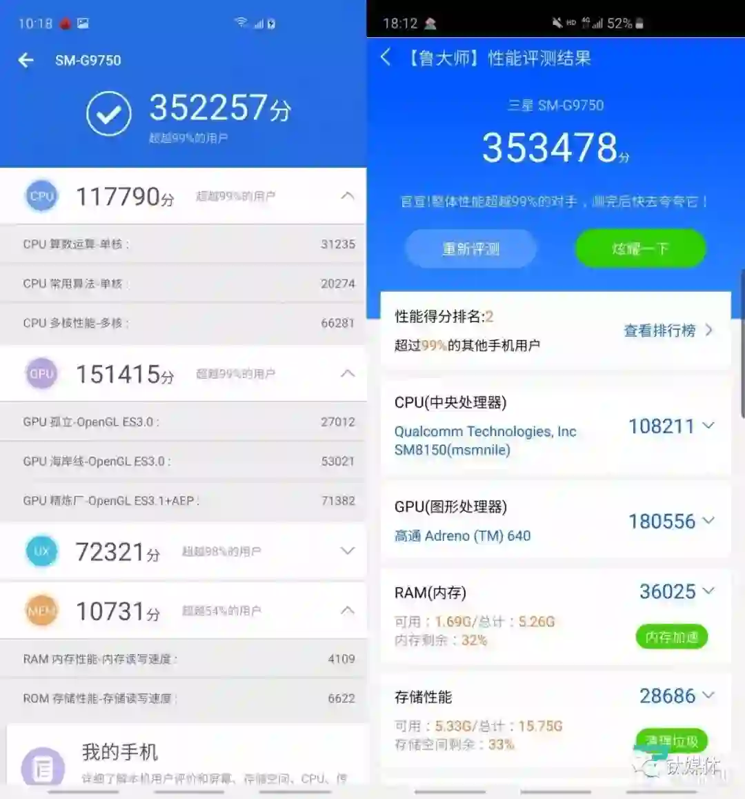 对于这个工程版的硬件跑分,大家可以做个参考,贩售版的产品应该会比这个得分更高。安兔兔得分为35.2万,鲁大师得分为35.3万,两个结果与之前测试的联想Z5 Pro GT比较接近。