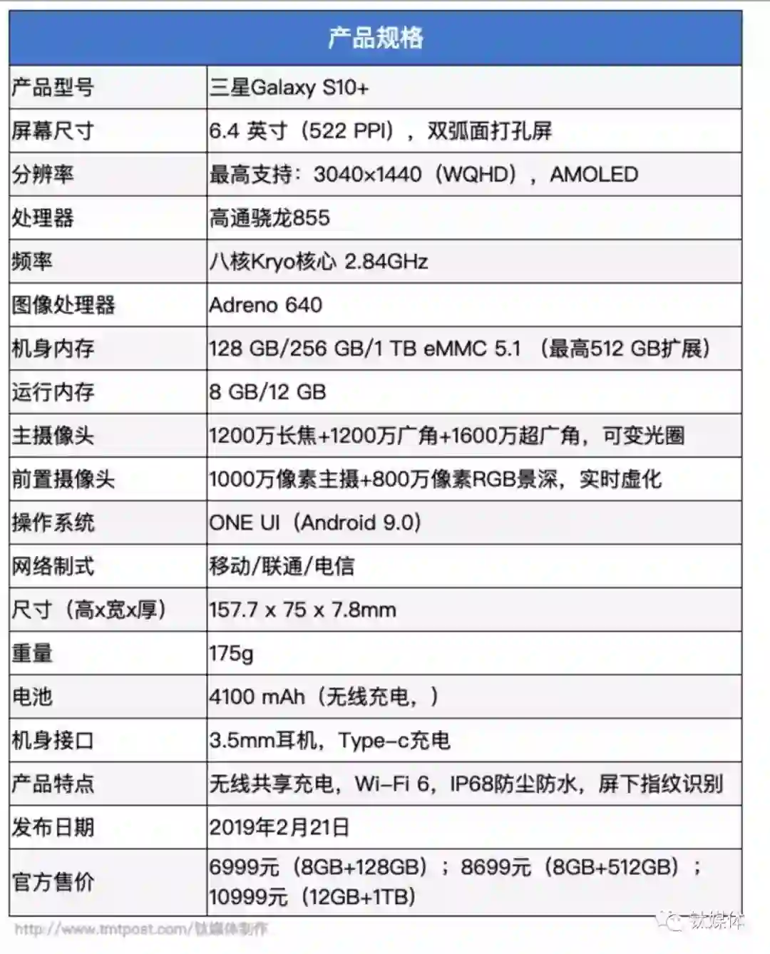 三星Galaxy S10+:8GB+128GB版 6999元;8GB+512GB版 8699元;12GB+1TB版 10999元。