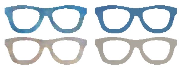 表 7:所选择的眼镜集合对的相对真实度。对于每两个集合之间的比较,我们都在括号中报告了每组中被研究参与者标记为真实的眼镜的比例;另外还报告了组之间的比值比(odds ratio)以及 χ2 独立性测验的 p 值。