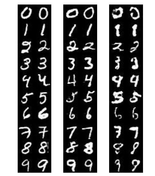 图 9:通过 AGN 生成的攻击示例。左图:来自 MNIST 的随机数字样本。中图:预训练的生成器生成的数字。右图:AGN 生成的被该数字识别 DNN 误分类的数字。