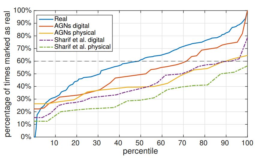 AGN 能得到可以大规模部署的攻击。我们特别展示了我们称之为「通用」的攻击,因为它们能得到一些(10 个或更少)恶意设计的眼镜,其中大部分(而不只是一个攻击者)都可以被用来避开人脸识别。