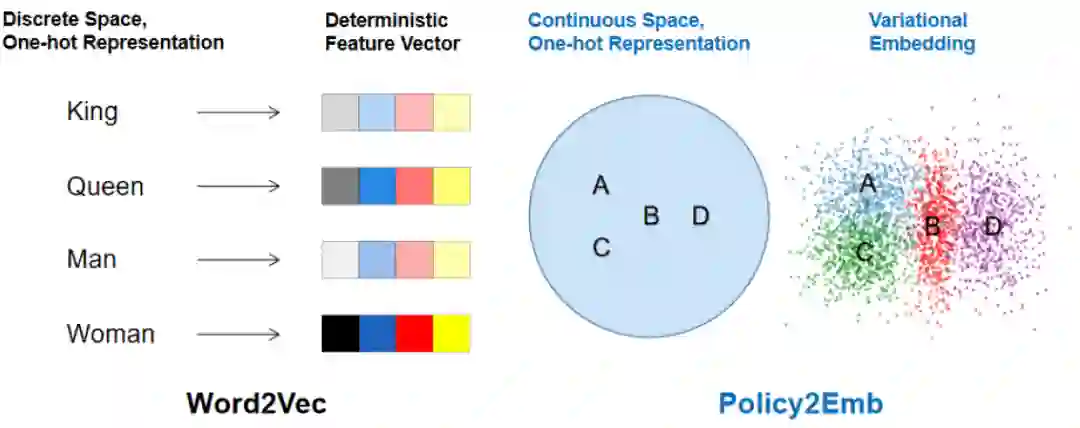 本文策略 embedding 学习方法 Policy2Emb 与经典词向量方法 Word2Vec 的一个对照。