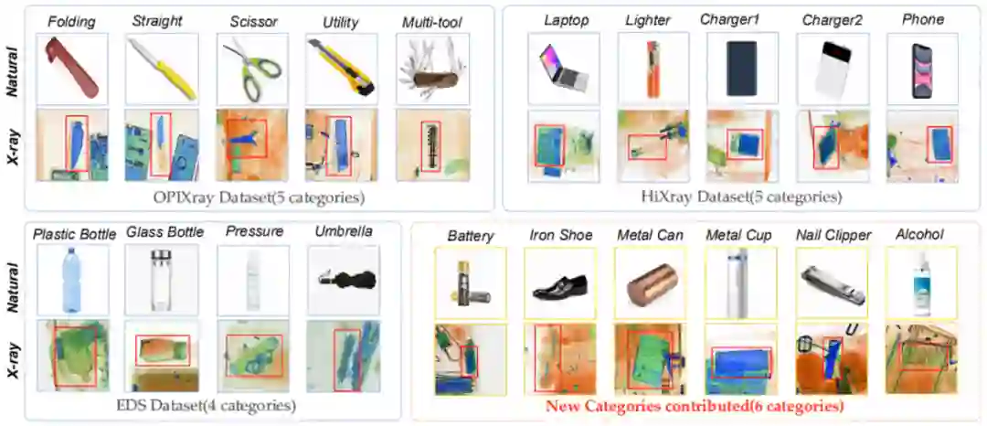 X-ray FSOD 数据集中不同类别的自然光和 X 光样例示意图。