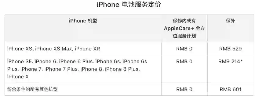 今年新出的三款 iPhone(Xʀ、XS、XS Max)的电池更换价格为 ¥529 ,价格依然是苹果风~受去年降频门的影响,苹果针对 SE~iPhone X 的 ¥214电池优惠更换计划将于 2018 年 12 月 31 日截止。优惠计划截止后,其他旧款 iPhone 的电池维修价格为 ¥369,而 iPhoneX 将会和今年新出的三款机型的电池价格一致(RMB529)。