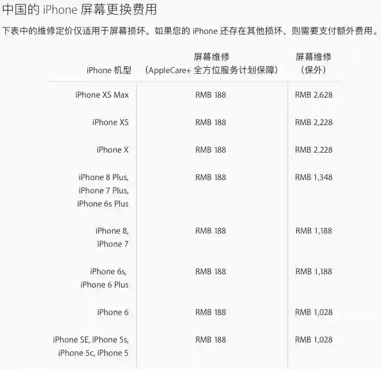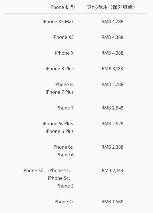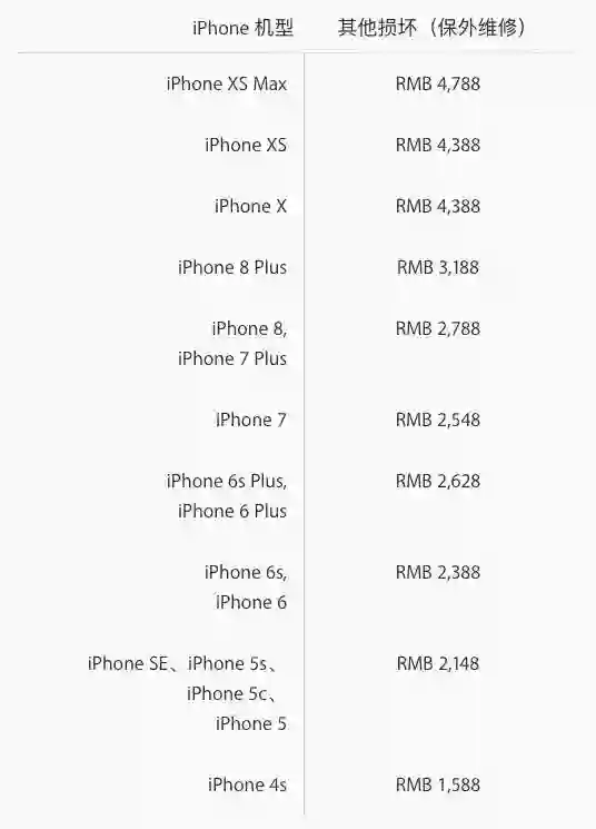iPhone XS 则与去年的 iPhone X 的保外其他损坏价格一致,为 ¥4388 。虽然苹果暂时没有公布暂未发售的 iPhone Xʀ 的维修报价,但是根据以往规律,应该和 iPhone XS 没差了。