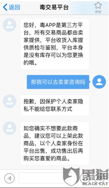 一名消费者通过毒APP以889元价格购买一双adidas Ultra Boost 4.0xParley Carbon 海洋之心,42.5尺码,自负顺丰邮费23元。收到鞋试穿后发现小半码,寻求客服更换时,被告知毒APP是第三方平台,所有商品由卖家提供,平台收货入库提供质检与鉴别服务,因平台本身没有库存,所以不可以更换。当买家提出联系卖家要求,客服回应:“抱歉,因保护个人卖家隐私不能给您联系方式。”还给出建议,如果确实不想要这款商品,建议在买家以卖家身份在平台出售。