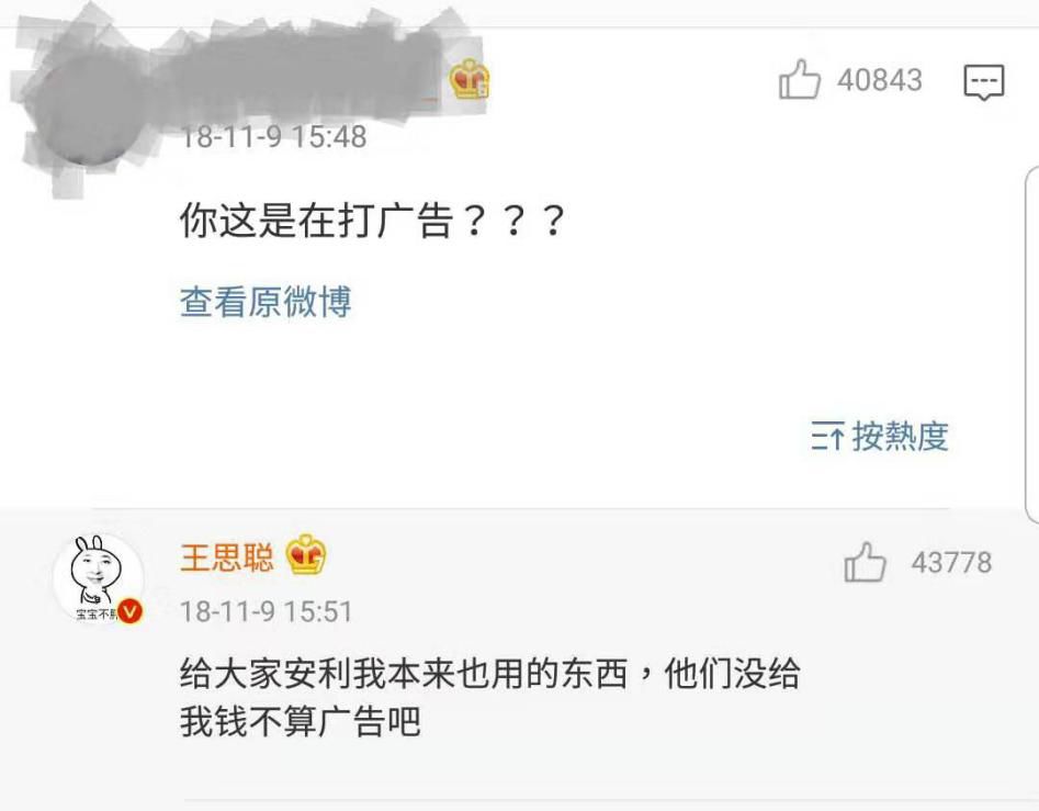 微博下方有网友质疑王思聪是否在打广告,他本人回应称,“给大家安利我本来也用的东西,他们没给我钱不算广告吧。”