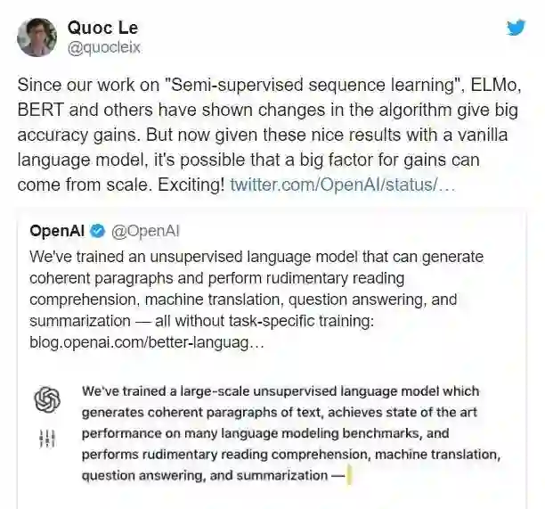 作为一个例子,我们只需要看看2019年的早期NLP感觉之一,OpenAI的GTP-s模型。GTP-2模型的发布受到了很多关注,因为创建者声称,考虑到大规模生成“虚假”内容的可能性,发布完整的预训练模型是危险的。不管它们的发布方法有什么优点,模型本身都是在Transformer架构上训练的。正如主要的AI专家Quoc Le所指出的,GTP-2版本展示了普通Transformer架构在大规模训练时的威力……