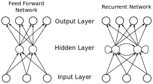 长期以来,RNNs一直是基于NLP的神经网络的基础架构。这些架构是真正的深度学习神经网络,是从早期的创新(如Word2Vec)设定的基准发展而来的。去年讨论最多的方法之一是ELMo(来自语言模型的嵌入),它使用RNNs提供最先进的嵌入表示,解决了以前方法的大多数缺点。从下图中可以看出,与前馈网络不同,RNNs允许隐藏层的循环返回到它们自己,并且以这种方式能够接受可变长度的序列输入。这就是为什么它们非常适合处理文本输入。