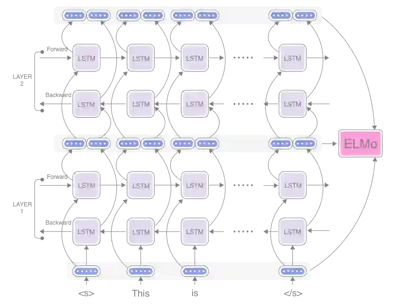这个图是一个两层ELMO架构的例子。您拥有的层越多,就可以从输入中了解到越多的上下文。低层识别基本语法和语法规则,而高层提取较高的上下文语义。ELMO使其更精确的另一个方面是它采用了双向语言建模。因此,不是简单地从开始到结束读取输入,而是从结束到开始读取输入。这使得它能够捕获句子中单词的完整上下文。如果没有这个,你必须假设一个特定单词的所有上下文都出现在单词之前或之后,这取决于你读它的方向。