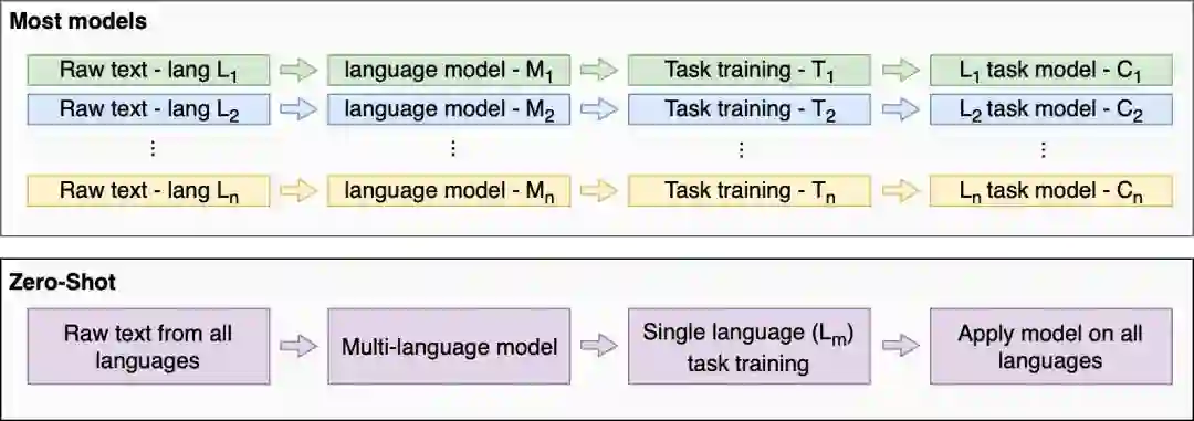 零样本学习是在一个非常大的数据集或一个非常不同的数据集上训练一个通用模型。然后您可以将此模型应用于任何任务。在翻译示例中,您将训练一个模型并将其用作其他语言的通用翻译程序。2018年底发表的一篇论文就做到了这一点,能够学习93种不同语言的句子表示。