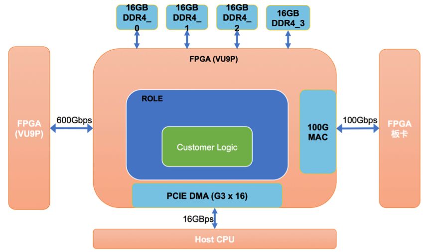 不少应用场景对板载的DDR存储还是有要求的。阿里云的F3实例,为每个FPGA搭配了客户可见的64GB的DDR内存,这64GB的DDR分成4个通道,分别连接到VU9P的3个硅单元上面,其中一个通道对应的16GB DDR保留常驻,其余3个通道对应的48GB存储以可选的方式可被客户逻辑加载使用。