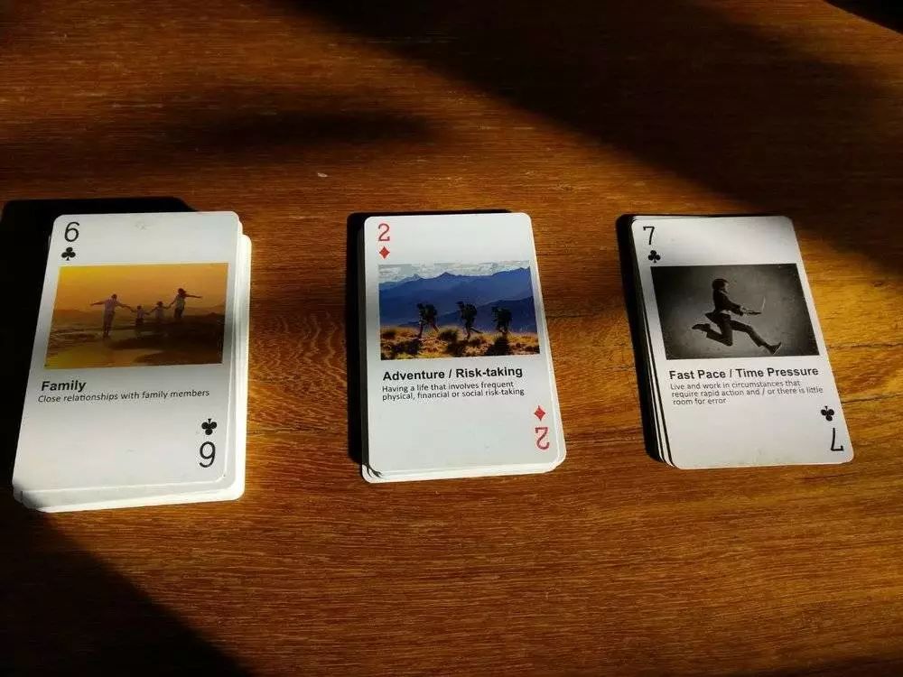如图所示,左侧牌堆的堆顶牌为“家庭”,显然,这位客户家庭观念很重;中间牌堆上最醒目的是“冒险和探险”,也就是说,他对于冒险精神不感兴趣;右侧堆顶是“节奏快、时间紧”,而这就意味着,嗯……他可能不适合在中国科技公司工作。