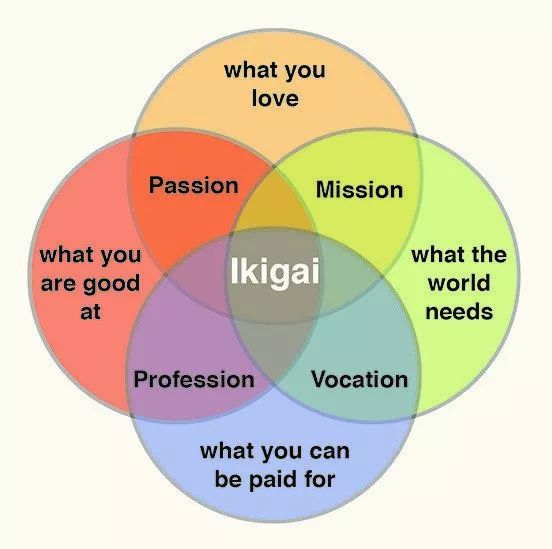 换句话说,激情、使命、天职、专业,四者的交集即是Ikigai。