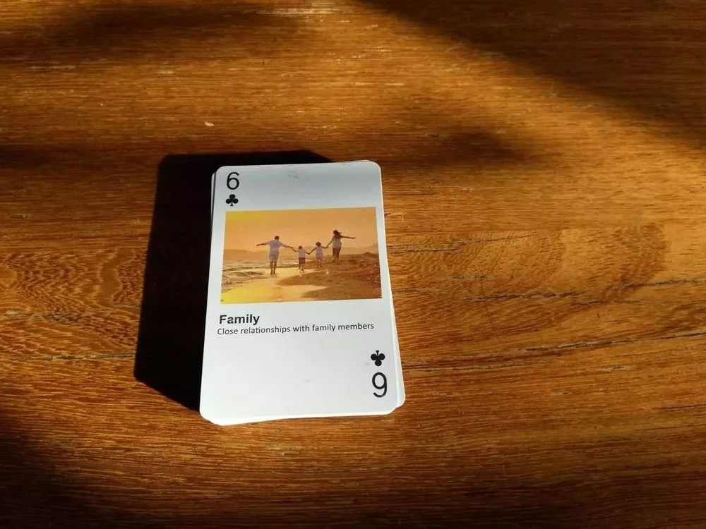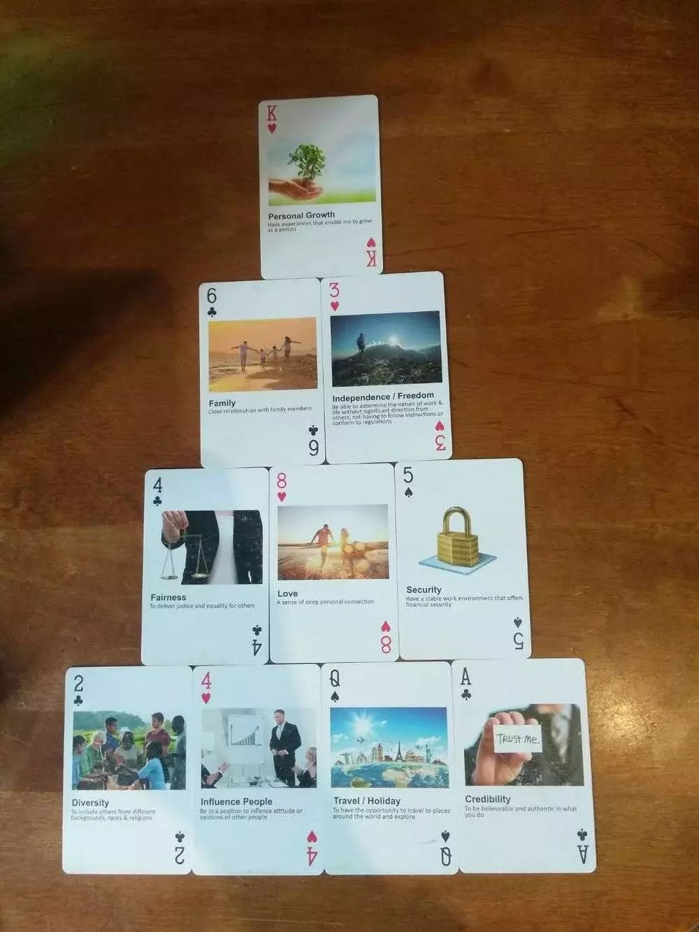 这个方法只需要一副扑克。而这副牌的特别之处仅仅在于,每一张牌上都有一个与工作和生活相关的抽象概念。比如,某张牌上可能写的是“爱情”,另一张写的是“友情”,其余的则可能是“物质奖励”、“名望”、“稳定”、“个人成长”等等。