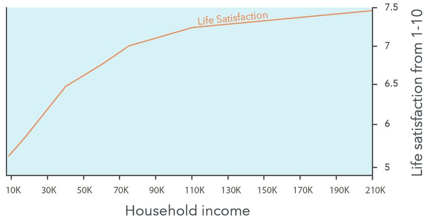而到了7~11万美元区间,钱的影响明显变小;随着人们的收入从11万美元逐渐增长到21万美元,钱与幸福感的正相关越来越弱;对于年入20万美元的美国人来说,他的幸福与否似乎已经与美元完全无关了。