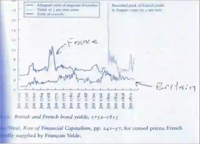 上图把从18世纪中期到19世纪中期,法国国债利率和英国的政府国债利率放在一起来看,大致上法国政府公债利率将近100年的时间里平均下来在6.5%左右,同期的英国政府国债利率大概是4%。从融资能力、金融市场发达的程度也决定了英国和法国长达200多年的竞争竞赛中,英国的融资能力更强,债务融资的量和成本、价格更有优势。这些方面对于英国海军从18世纪后期一直到19世纪中期带来的结果是非常关键的。