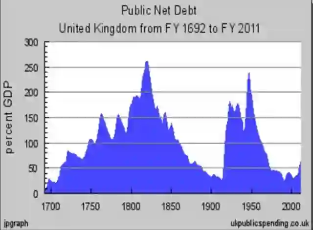国债余额在拿破仑时期达到了顶峰,相当于英国当时GDP的2.6倍。1826年左右英国议会通过一个法案,要求英国政府以后每年可以有财政盈余,不能有财政赤字,必须每年想办法还掉国债。那时候开始,英国的国债余额相对GDP的水平一直下降,到什么时候达到了最低点?恰恰在1914之前,就是一战之前,在我们认为大英帝国正式结束的时候,也是英国国债余额最低的时候。