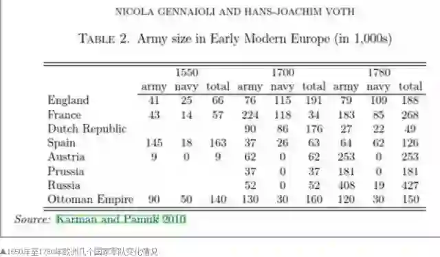 在热兵器慢慢进入西欧军队早期时,1550年前后,英国的正规军大概是66000人,到了1700年以后上升到19万人。法国军人增长幅度更大,1550年左右大概只有5.7万人正规军,1780年上升到26万。