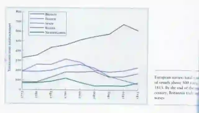 下图反映的就是海军军舰的容量,上面的线是英国的,1775年开始一直到1815年。下面反映的是法国、西班牙等等其他西欧国家的海军实力对比。