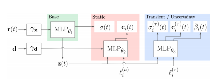 我们来看NeRF-W的整体架构。给定3D位置r(t),观察方向d,外观嵌入li(a)和瞬态嵌入li(τ),NeRF-W会产生差分不透明度σ(t),σi(τ)(t), 颜色ci(t),c(τ)i(t)和不确定性βi(t)。