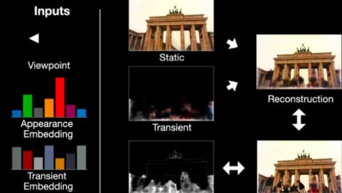 虽然NeRF可以很好地处理受控状态下拍摄的静态图像,但无法在变化的环境中建模,例如光影的变化、出现临时遮挡物等,谷歌研究人员之所以把新模型命名为