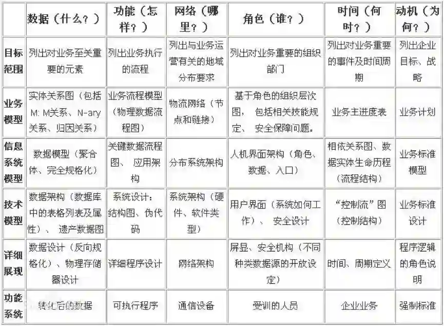 其实,业务架构这个词并不新,它隐藏在企业架构(EA)中。企业架构是上世纪 80 年代的产物,其标志就是 1987 年 Zachman 提出的企业架构模型,该模型按照“5W1H”,即 what(数据)、how(功能)、where(网络)、who(角色)、when(时间)、why(动机)六个维度,结合目标范围、业务模型、信息系统模型、技术模型、详细展现、功能系统六个层次,将企业架构分成 36 个组成部分,描述了一个完整的企业架构要考虑的内容,详图如下: