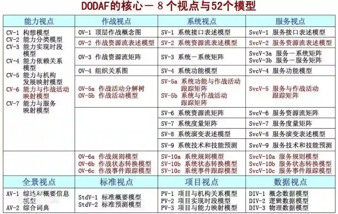 TOGAF 之后,又先后诞生了 FEA(联邦企业架构)和 DODAF(美国国防部体系架构框架)。前者的体系由五个参考模型组成:绩效参考模型(PRM)、业务参考模型(BRM)、服务构件参考模型(FRM)、数据参考模型(DRM)、技术参考模型(TRM),该方法应用于美国电子政务领域,着眼于跨部门、跨机构提升业务效率,解决重复建设、信息孤岛等问题,很具有“企业级”理念,虽然没有明确的业务架构定义,但是很好地应用了业务架构的思维。后者体系挺复杂的,8 个视点 52 个模型,但是实用性不错,美国国防部和一些企业在用,详细内容如下:
