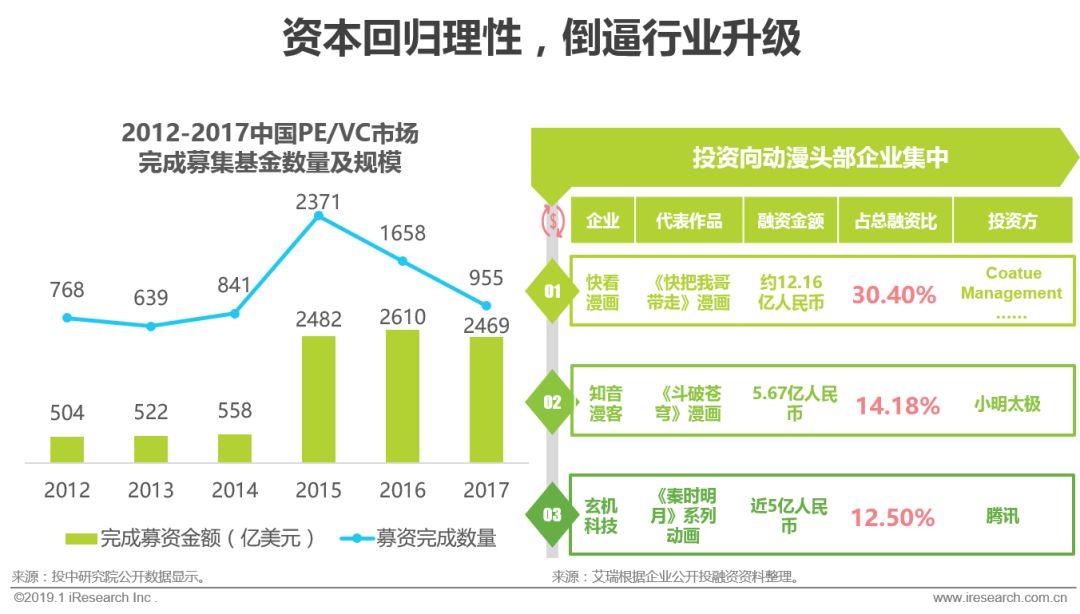 互联网时代,企业的估值往往通过用户数来评估用户价值进而评估企业价值,在前两年资本市场资金充裕的情况下,多数动漫企业为了抢占市场,采用“亏本赚吆喝”的经营模式,利用PE/VC的资金来维持企业运转,用时间换空间。但在当前经济增速放缓、企业融资难得大环境背景下,这样得经营模式显然很难持续下去。2018年,《少年锦衣卫》的制作方柏言映画被曝长期欠薪,就连腾讯动漫也被爆过拖欠作者稿费的事件。但是,从另一个方面来看,在市场投资资金减少,资金更多流向回收几率高的企业的情况下,也能倒逼动漫企业进行企业战略升级, IP价值不高的作品被腰斩,精品提案被保留,淘汰一批品质低下的企业,挤出泡沫,形成更加稳定的市场体系。