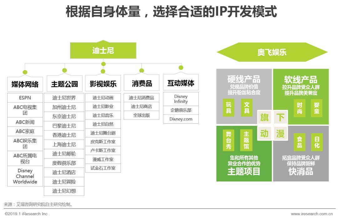 在全球范围内,内部衍生一体化经营最为成功的动漫企业应该属迪士尼集团莫属了。在产业链上游,迪士尼旗下有皮克斯、漫威、卢卡斯等,在播映渠道上,迪士尼掌握覆盖大规模受众的媒体网络,在下游衍生开发环节,迪士尼的主题公园和度假区遍布全球,周边衍生产品备受追捧。以国内企业为例,虽然尚未出现如迪士尼集团般完备的一体化经营的动漫企业,但也有一些企业依靠自己内部衍生从而覆盖到产业链的上下游,自己回收内容红利和衍生收入,如一直以“东方迪士尼”为发展方向的奥飞娱乐。但企业在借鉴迪士尼模式时,也要审时度势量力而行。