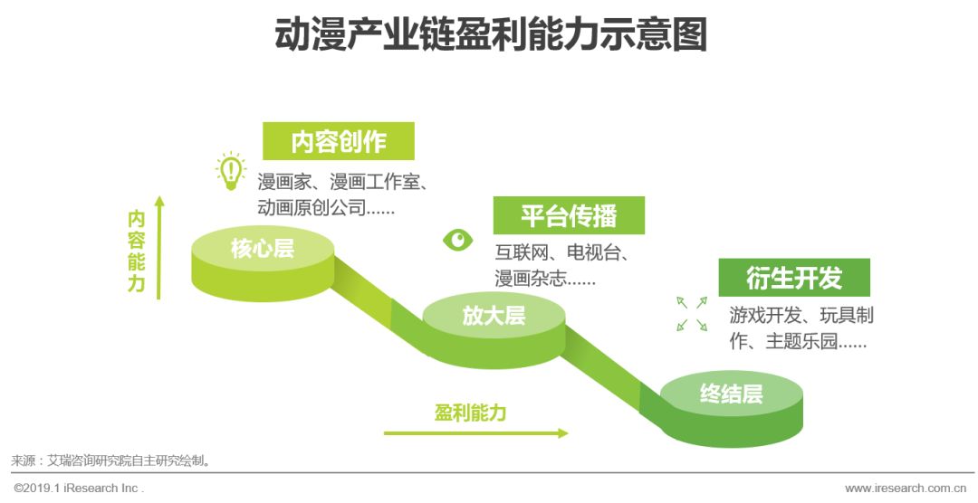 在这个文化消费降维时代,动漫产业作为IP富矿,具有巨大的IP衍生开发价值。对于动漫产业链上游企业而言,掌控明星IP,相当于对下游产业变现环节的垄断。但是 ,从盈利能力来看,IP 终结层最高,IP 放大层次之,而IP 核心层最弱,IP 产业链的盈利能力按产业链的方向逐步放大。因此,打造完整产业链必将是动漫企业未来最大的盈利方向。但是,是选择内部衍生一体化经营,还是利用各自比较优势联合发展,取决于企业在产业链中所处的位置以及自身的规模体量。