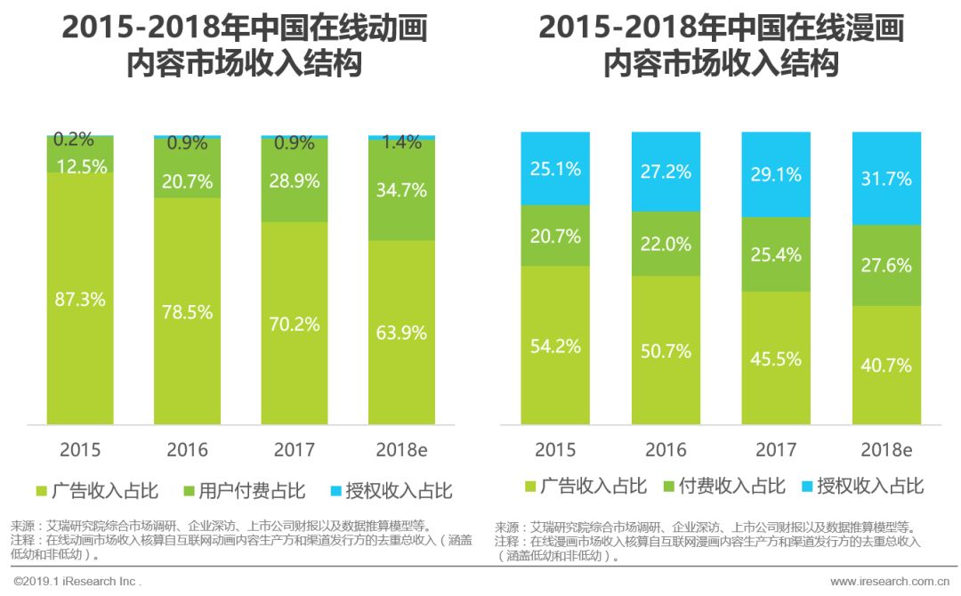动画收入更多在内容播映,漫画收入授权衍生占比更高