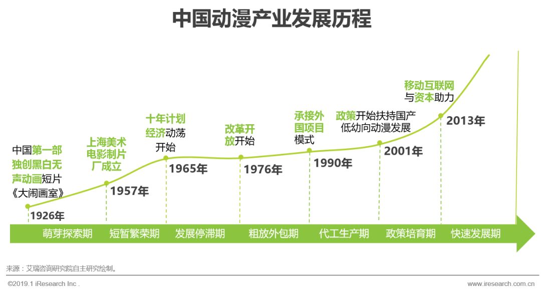 1926 年万氏兄弟打造了中国第一部独创黑白无声 10 分钟动画短片《大闹画室》, 助推1926-1945年中国动画进入萌芽探索期。此后,中国动漫产业的发展跟随着中国经济的发展起起伏伏,一直没有特别大的突破,直到2013年以来得益于移动互联网的发展和普及,互联网巨头们纷纷进入动漫产业布局,腾讯、网易等在文娱产业的资本投入助推中国动漫产业的逐渐发展,2013年中国动漫产业逐渐进入快速发展期。