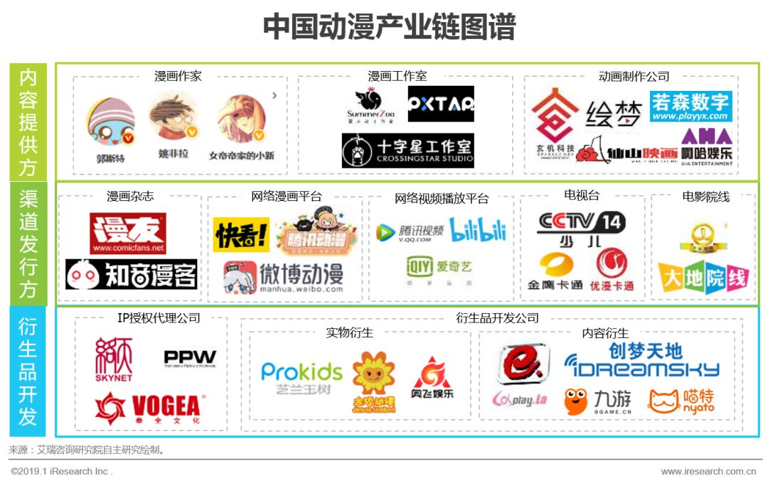 动漫产业的产业链构成主要可以分为上中下游三个环节。产业链的上游是内容方,主要包括原创动画公司和漫画公司等IP内容的提供方。产业链的中游是渠道发行方,其中,动画的主要发行方包括网络视频播放平台,电视台以及电影院线等;漫画的主要发行方则主要是各类漫画杂志和网络漫画平台。产业链的下游则是基于IP的衍生品开发公司,包括IP授权代理公司,也包括衍生品开发公司,而衍生品则包括游戏、玩具、服装、主题公园等等。