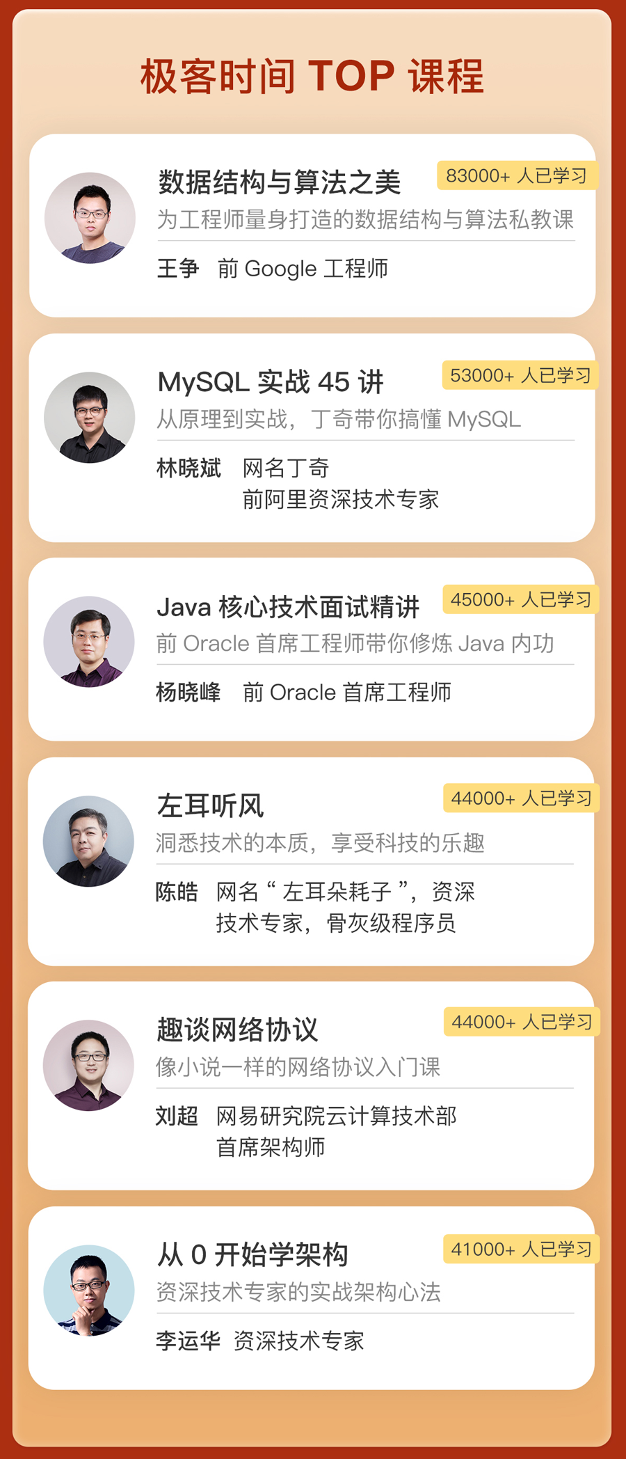 极客时间的导师来自 BAT、Google、Facebook、Intel 等国内外一线互联网企业,均为拥有丰富技术实战经验的资深技术专家。在课程中,导师们会从问题为出发点,将核心知识与实际应用结合起来,让你学完能解决实际中的问题,提高研发效能。