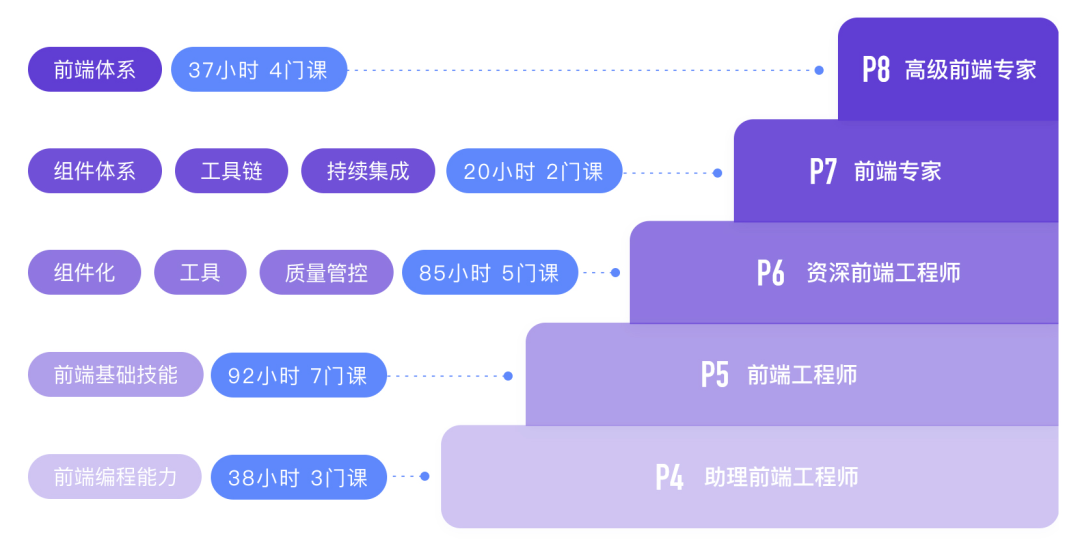 除了建立基于岗位的知识体系之外,还全方位支持“自驱学习”。极客时间为你设计了清晰高效的“阶梯式学习”方案,如下图:前端工程师的阶梯能力建设方案。