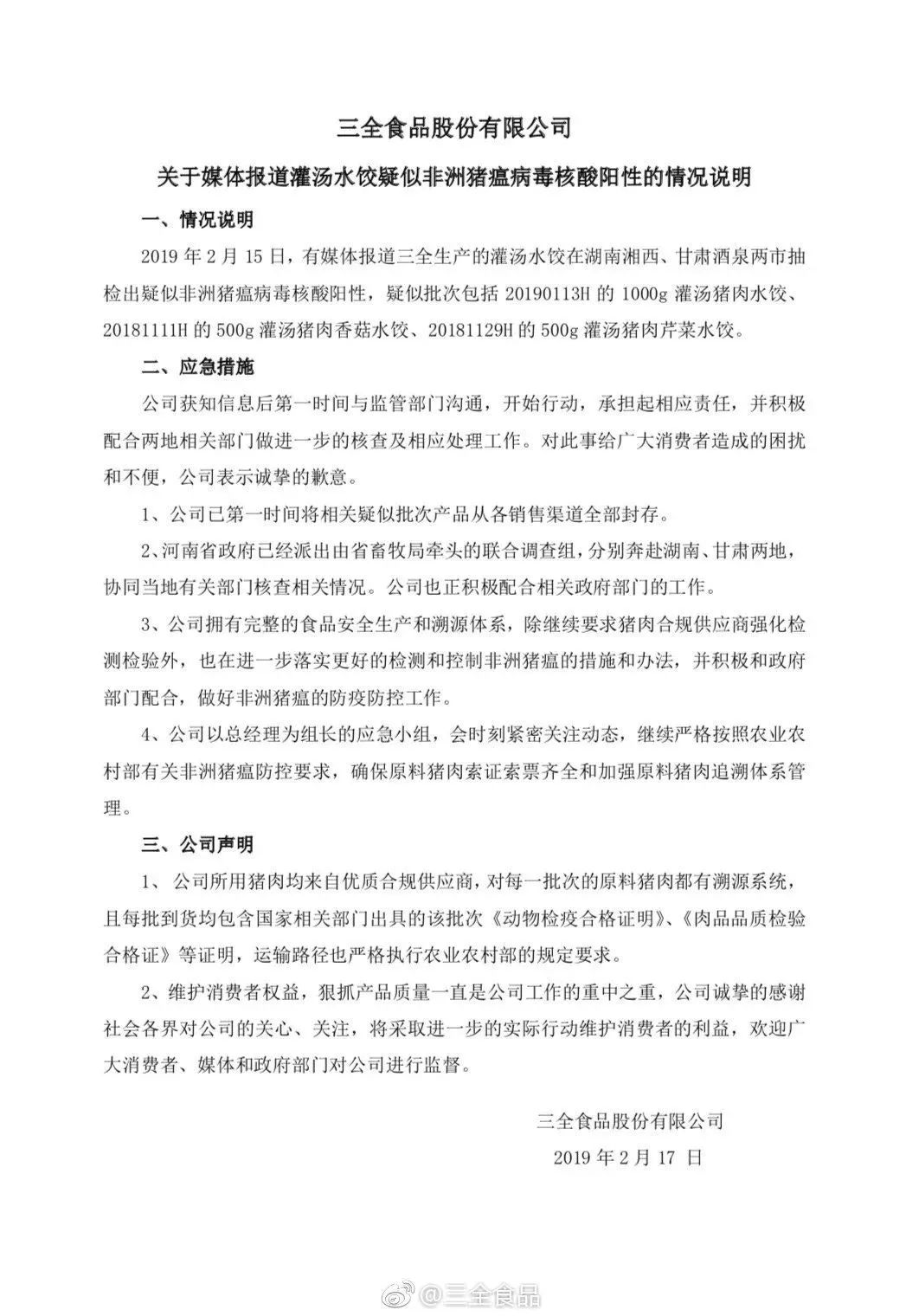 针对媒体报道灌汤水饺疑似非洲猪瘟病毒核酸阳性,三全食品 2 月 18 日早间披露公告称,公司已第一时间将相关疑似批次产品从各销售渠道全部封存;河南省政府已经派出由省畜牧局牵头的联合调查组,分别奔赴湖南、甘肃两地,协同当地有关部门核查相关情况。公司也正积极配合相关政府部门的工作。三全食品声明称,公司所用猪肉均来自优质合规供应商,对每一批次的原料猪肉都有溯源系。