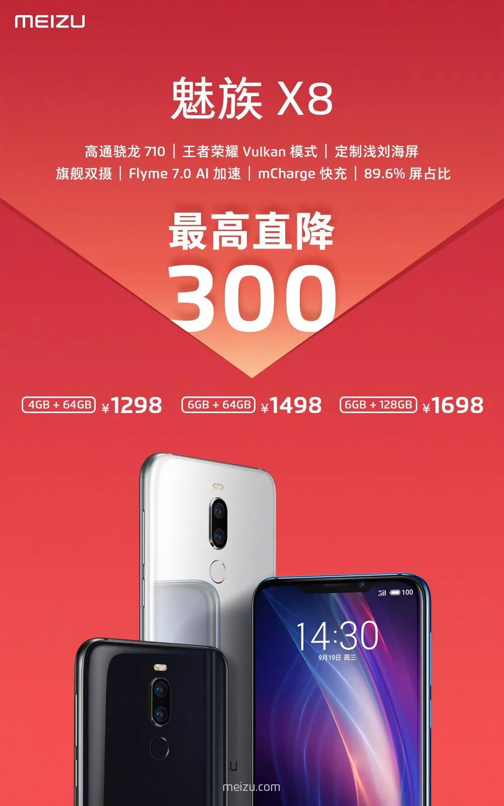 今天,魅族 X8 官方宣布降价,4+64GB 从原来的 1598 元降到 1298 元,6+64GB 从原来的 1798 元降到 1498 元,6+128GB 从 1998 降到 1698 元。降价的魅族 X8 可能是最便宜的骁龙 710 手机了。