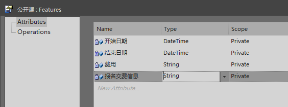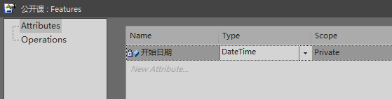 【步骤2】单击“Details”页签,单击“Attributes”按钮,在“Name”栏输入“开始日期”,“Type”栏输入“DateTime”。