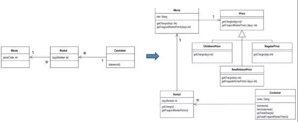 Martin Fowler在《重构》("Refactoring: Improving the Design of Existing Code")[Fowler 1999]的第一章举了一个影片出租店的例子,先展示快而脏的代码,然后再不断重构,得到更合理的结构,内容确实很容易打动新手。类图如图8-9所示。