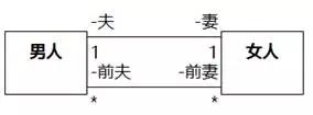 图8-108左侧是正确的。在任何时间拍摄快照,拍到的应该是一个男人最多和一个女人有夫妻关联。即使有其他女人,当时的夫妻关联应该已经断开了,如果要表达关联,只能叫“前妻”。如图8-109所示。在某个时间拍快照,是有可能拍到一个男人存在多个前妻的。
