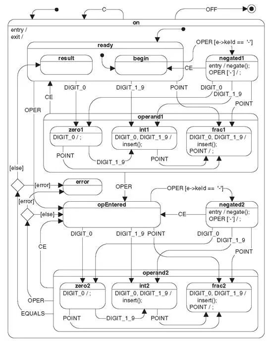 图8-15是Miro Samek在他的书[Samek 2008]中举的计算器例子。小小计算器要做到没有漏洞,其中的思考也很复杂。如果不先用层次状态机的图形对领域逻辑显式建模,再根据模型通过工具或人工映射到实现,而是直接下手实现,领域逻辑靠临时脑补,得到的代码必定破绽百出。[5]