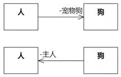 关于确定关联的方向原则,我们先来看看常被讨论的人和狗的例子。如图8-103,日常生活中我们可以说人养了宠物狗,也可以说狗有主人,假设系统要记住人和狗的关联,哪一个更合适呢?