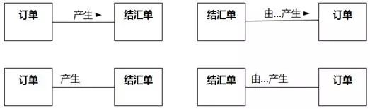 如果是给关联命名,最好给名称添加一个阅读方向,如图8-101所示,方向指示领域知识为“订单产生结汇单”。不过要注意,这个阅读方向只是为了方便理解领域知识,和关联的导航方向没有关系。有的建模工具不支持标注关联方向,可以通过统一偏向某一侧来表达阅读方向。