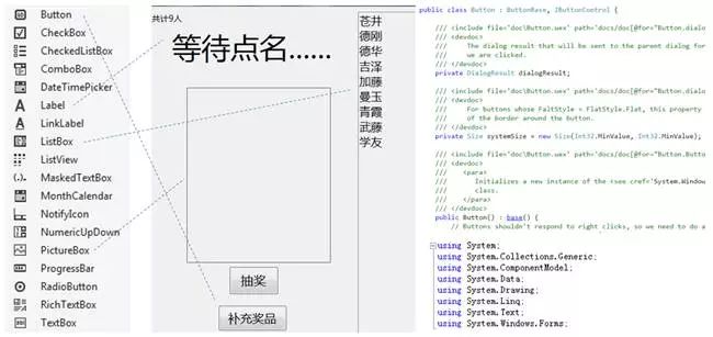 软件开发方法的发展史,就是不断提升复用级别的历史。比起很多年以前,现在的软件开发在图形界面、网络协议、数据存取等基础设施领域的复用上,已经达到了相当的高度。例如要做图8-5这样的一个点名抽奖工具,需要人工编辑的介质(即所谓"源代码")只需要几十行字符,其它部分的逻辑已经由基础设施封装了。