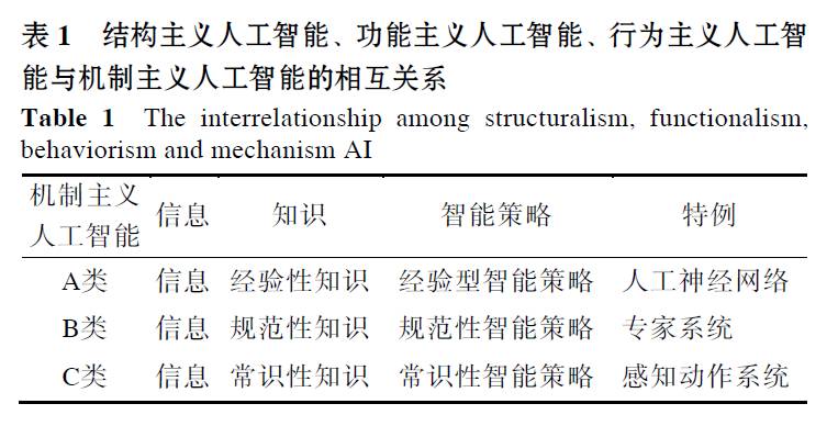 表 1 结构主义人工智能、功能主义人工智能、行为主义人工智能与机制主义人工智能的相互关系
