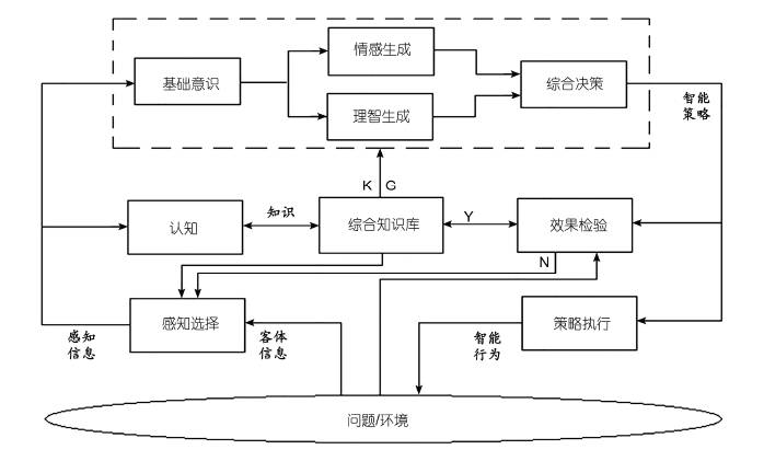 图2的模型看上去很复杂, 涉及到感知选择、认知、基础意识、情感、理智、综合决策和执行等复杂功能. 但是贯穿模型全局过程的功能主线却非常清晰, 这就是图中黑色楷体示出的“客体信息→感知信息→知识→智能策略→智能行为”转换, 或者也可以简记为“信息→知识→智能”转换. 这些转换过程构成了一切智能系统(人类智能系统和人工智能系统)智能生成的共性核心机制.