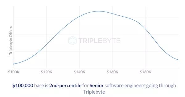 但Triplebyte认为这些非薪资组成部分在单一的数轴上进行比较是不合理的,所以只有一个底薪的统计。