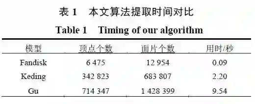 结果表明采用本文算法可以更为准确地提取尖锐特征点,且得到的特征点更为连续,有利于进一步的处理。本文使用的3个模型点数在6千~80万之间,这些模型都可以在1~10s之间得到最终的提取结果,具有较高的效率。