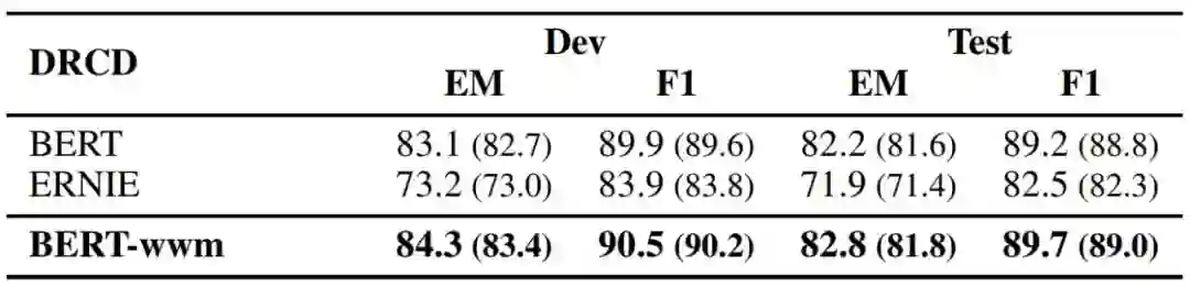 表 4:各个模型的表现。最好的模型学习率分别为:BERT (3e-5)、 BERT-wwm (3e-5)、ERNIE (8e-5)。